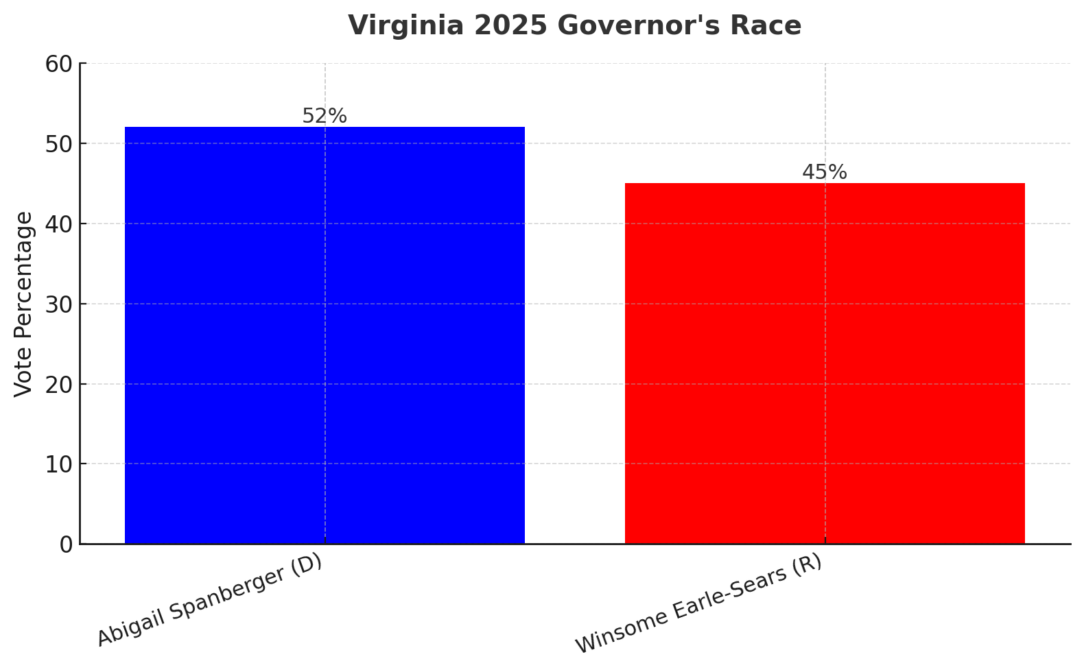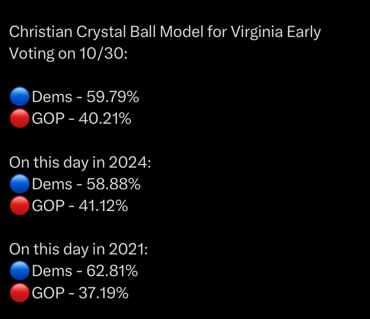 Because Virginia is a state heavily affected by federal government shutdowns and proximity to D.C., and given that Harris won it by six points, you’d expect Democrats to win each statewide race by at least five points or more.
