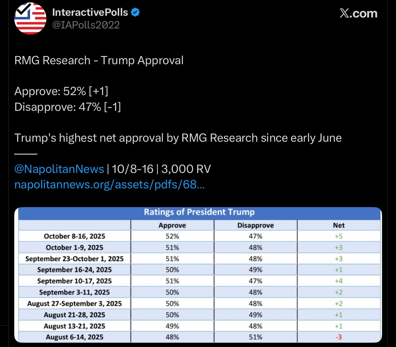 This tightening comes as President Donald Trump’s approval rating remains steady nationwide. A recent Emerson College poll shows Trump at 45% approval to 48% disapproval, while a new RMG Research survey recorded his highest rating yet—52% approval.