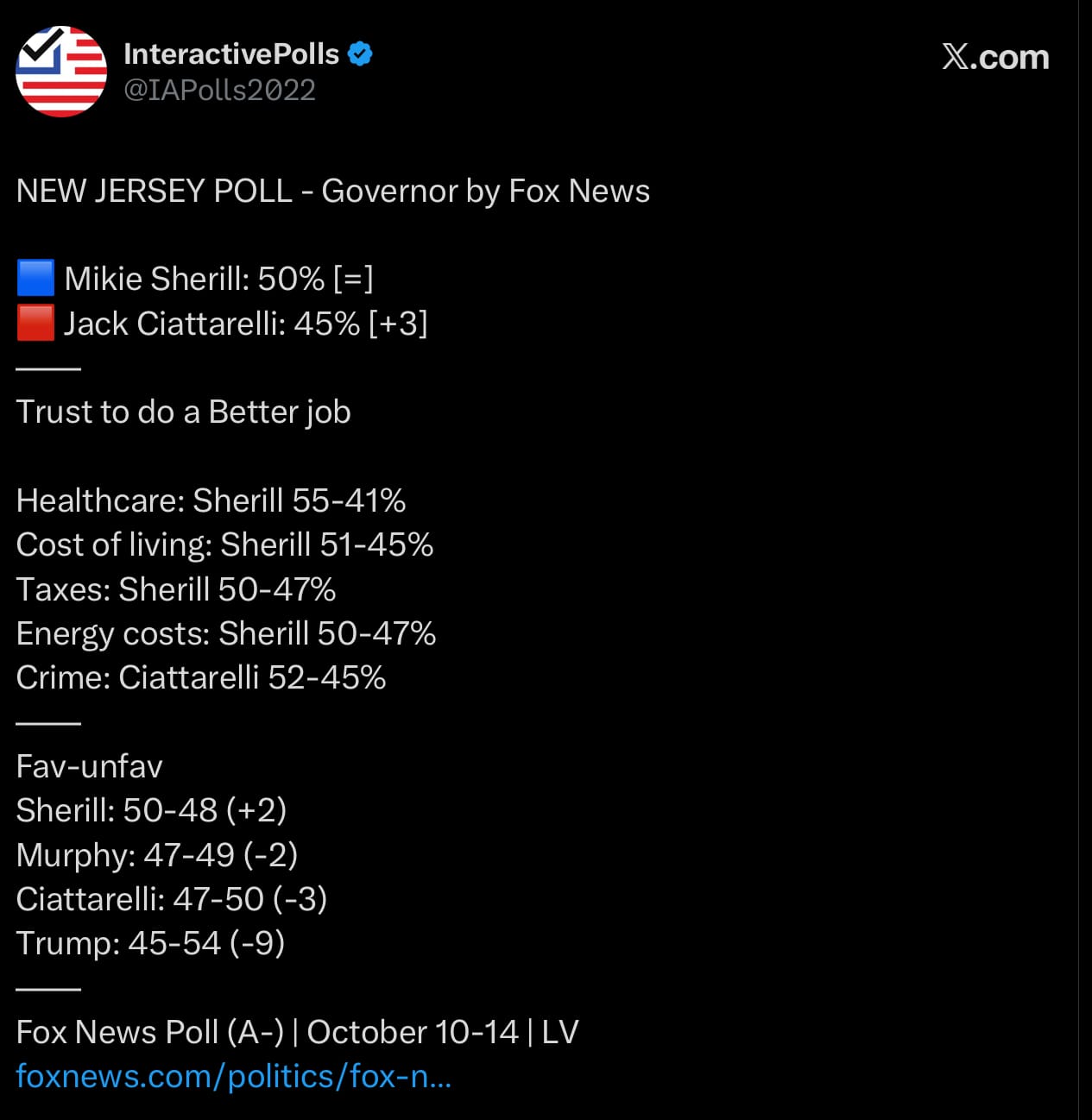 A Fox News poll in New Jersey found Sherrill ahead by five points, but that still represents a three-point improvement for Ciattarelli compared to previous surveys. The overall trend suggests that Republicans are closing the gap in both traditionally blue states.